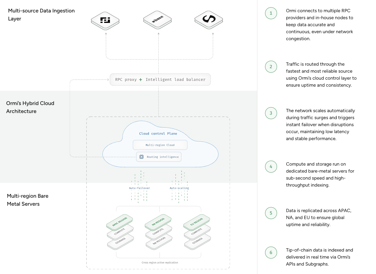 With 99.9% uptime and deployments across ecosystems representing $50B+ in TVL and $100B+ in annual transaction volume, Ormi is trusted to power the most demanding production environments without throttling or delay.