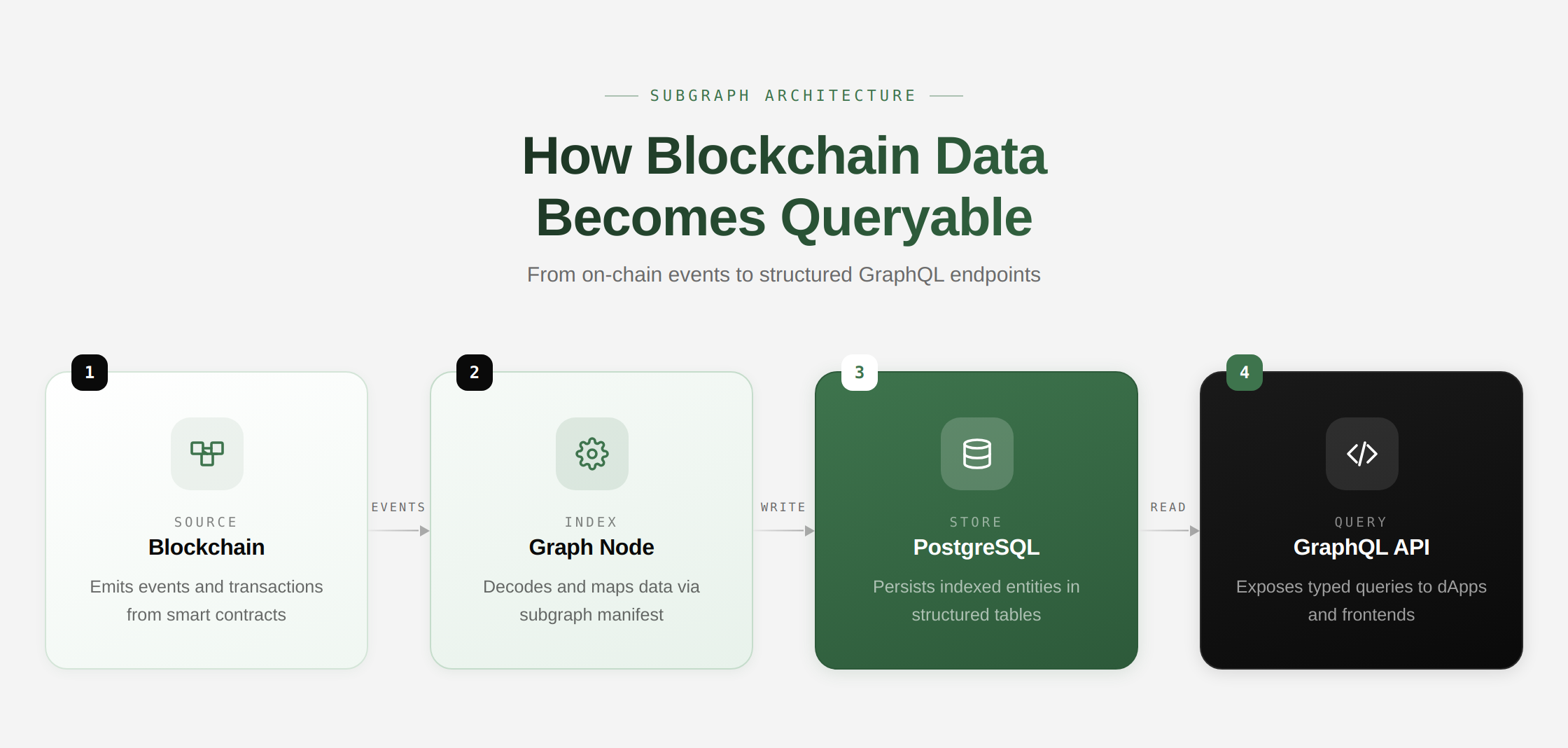 Subgraphs allow applications to query blockchain data efficiently without scanning raw chain history. Instead of repeatedly calling RPC endpoints, developers define how contract events should be indexed and stored in a database.